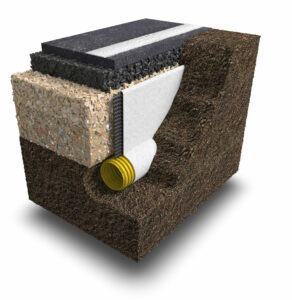 ABG Fildrain Type 6 highway edge fin drain provides vertical drainage on both sides, whilst acting as a barrier to protect the sub-base from inundation from the road verge. Fildrain Type 6 fin drain system is a double cuspated drainage geocomposite fully, wrapped with a filter geotextile and an integral pipe sleeve. The Fildrain geocomposite is laid alongside the trench, threaded with perforated pipe and dropped into a narrow trench before backfilling by pushing and compacting the excavated soil back into the trench adjacent to the drain. The surface is then covered with soil or a shallow apron of stone.