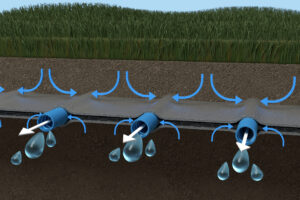 In order to maintain the laboratory measured permeability once installed on site, the drainage gravel needs to be wrapped in a geotextile or encased within porous concrete to prevent fine grained soil from mixing with the gravel and clogging the voids – which greatly reduces the permeability of the gravel.