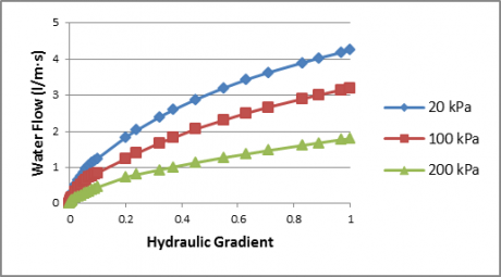 Each flow test is reported with the hydraulic gradient, compressive stress, and type of platens used during tests. By testing at several different hydraulic gradients for each compressive stress, and interpolating between results, a flow chart can be assembled which will allow the maximum flow rate in the geocomposite to be estimated for any given hydraulic gradient (see Figure 2).