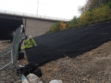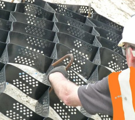 The permeable honeycomb structure of the Erosaweb geocell system has been developed for topsoil/stone retention on steep road embankment slopes. Once installed the geocellular structure forms a blanket of shallow pockets across the slope face into which fill is placed, protecting the slope and fill from erosion forces whilst allowing vegetation to establish for long-term protection.