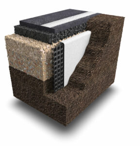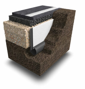 ABG Fildrain Type 6 highway edge fin drain provides vertical drainage on both sides, whilst acting as a barrier to protect the sub-base from inundation from the road verge. Fildrain Type 6 fin drain system is a double cuspated drainage geocomposite fully, wrapped with a filter geotextile and an integral pipe sleeve. The Fildrain geocomposite is laid alongside the trench, threaded with perforated pipe and dropped into a narrow trench before backfilling by pushing and compacting the excavated soil back into the trench adjacent to the drain. The surface is then covered with soil or a shallow apron of stone.