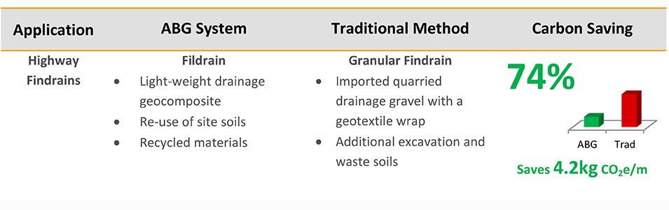 The use of ABG’s Fildrain Highway Edge Fin Drain Drainage Geocomposites can save up to 74% on carbon footprint when compared with traditional granular soil drainage methods: