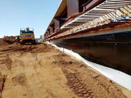 Road under rail structure utilising Deckdrain to allow more site won fill to be used Deckdrain drainage layer installed prior to bridge slide allows accelerated fill placement and reduced possession time.