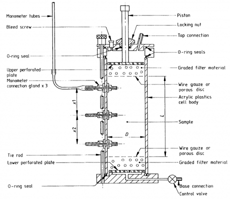When considering drainage gravel, permeability is measured in the laboratory using the methods described in BS 1377-5:1990 (see Figure 3). The test procedure is similar in principle to that used with drainage geocomposites, in that a constant hydraulic gradient is applied to a saturated gravel sample and the rate of outflow is measured.