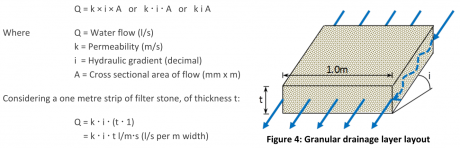 The best method for comparing geocomposite flow results with water flow in a drainage layer is to compare results in the conditions that are expected on site. For example, in a vertical drainage situation behind a retaining wall, the geocomposite flow results should be at a hydraulic gradient of 1.0, using soft platens, at a pressure related to the maximum horizontal earth pressure at the base of the wall. The maximum water flow rate in gravel can be assessed using Darcy’s Law (see Figure 4), and compared directly with suitable geocomposite flow results.