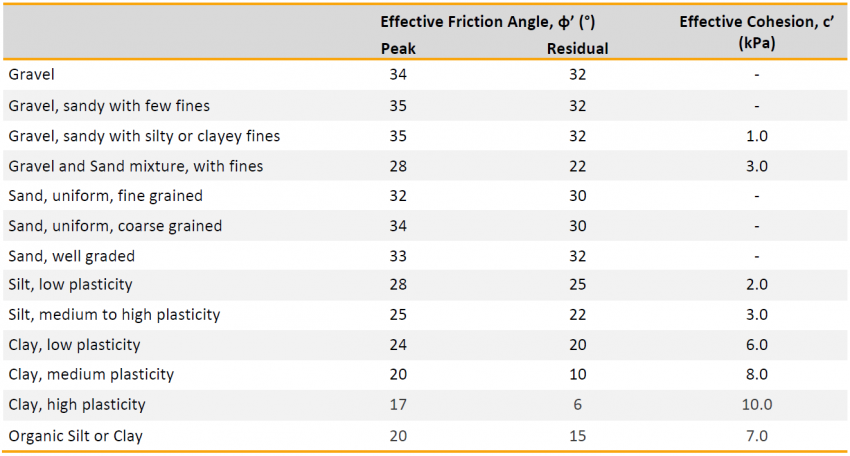 Typical shear strength parameters for various soils have been estimated by several sources depending on the amount of information available. Broadly speaking, information about the soil, and the method of estimating shear strength falls into one of two categories: