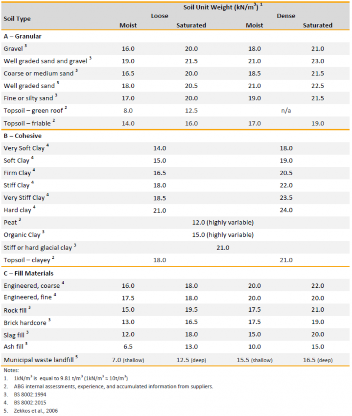 Several studies have attempted to assess a typical unit weight for a given soil type and a typical use of the information in BS 8002, as well as other sources, and values accumulated in over 30 years of operation. This information has been combined into Table 1, below.